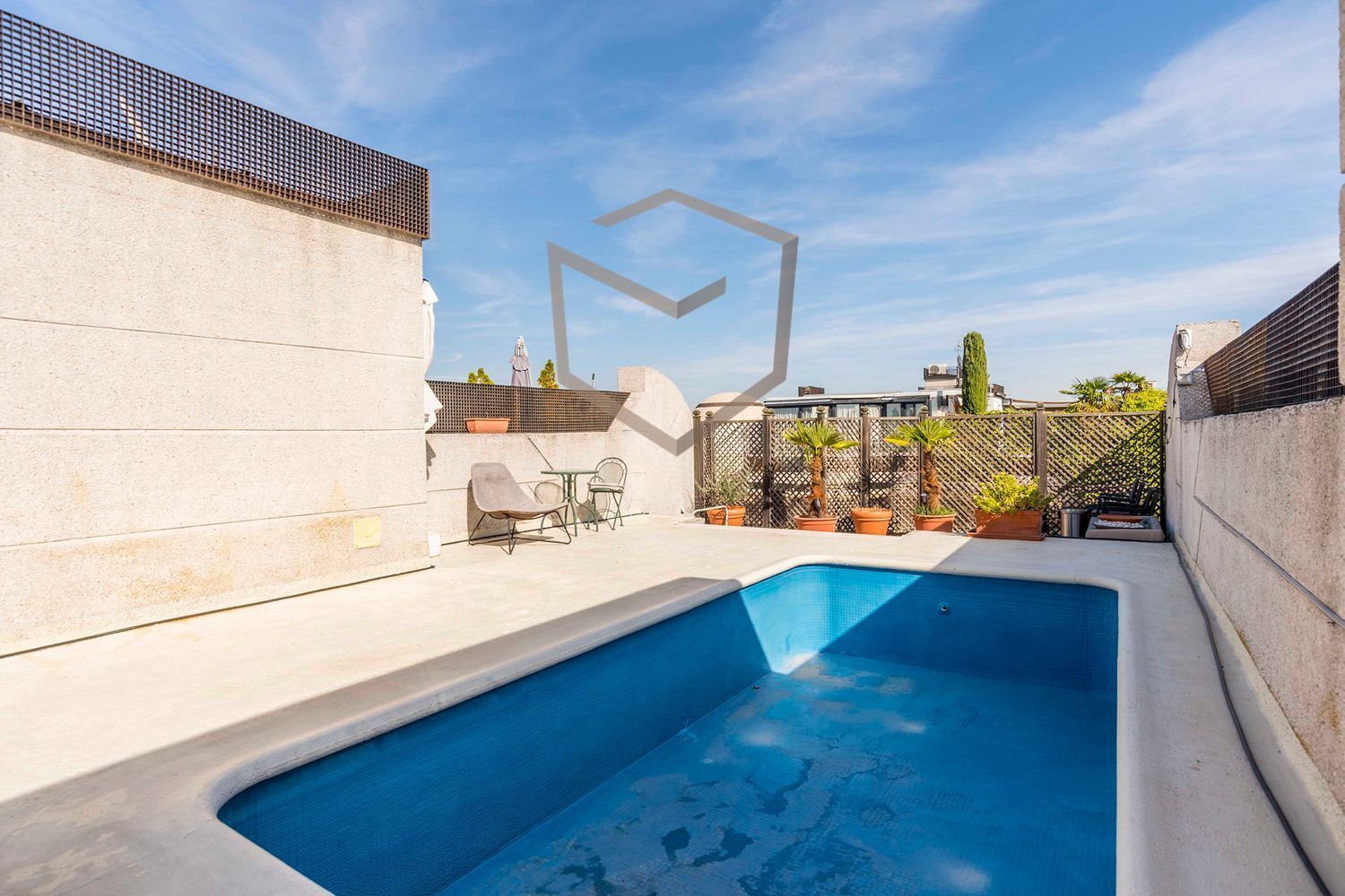 El salón comedor amplio y luminoso ofrece vistas a las zonas comunes de la urbanización. La terraza de aproximadamente 100m² cuenta con piscina privada y zona para comedor.